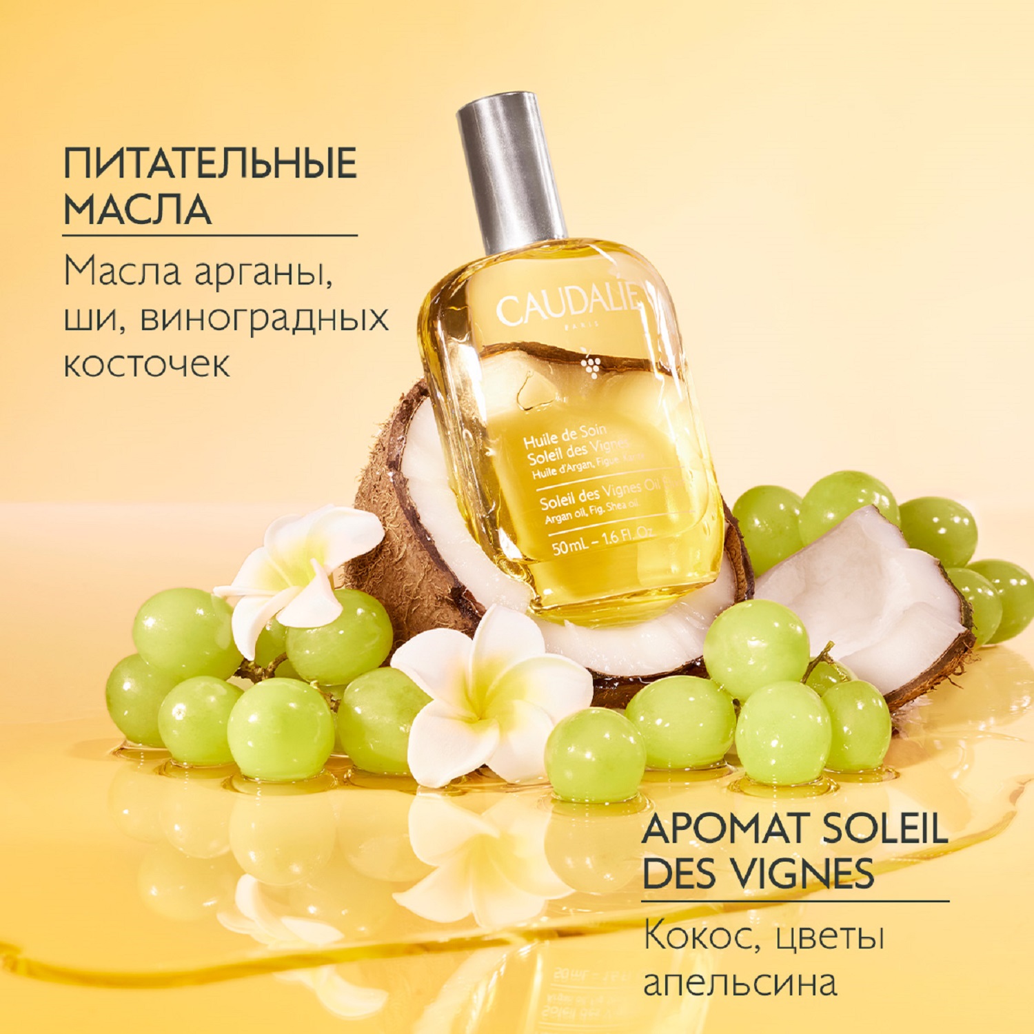 Сухое масло для тела Soleil de Vignes -- это питательное масло для тела. Обогащенное аргановым маслом, маслом ши, маслами виноградной косточки и миндаля. Это средство повышает эластичность кожи и мгновенно наполняет ее сиянием. Фирменный аромат Soleil des Vignes раскрывается на коже нотами кокоса, флердоранжа и жасмина, напоминая Вам о тёплом лете в любую погоду.